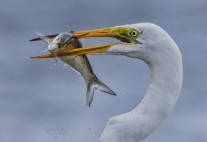 Great Blue Heron trying to steal a Great Egret's fish.