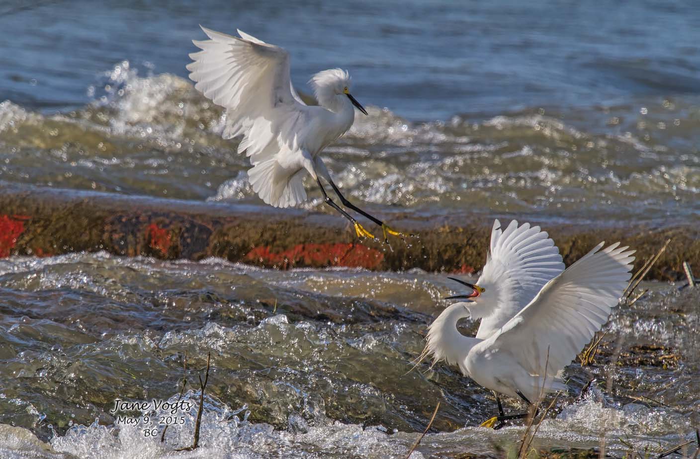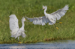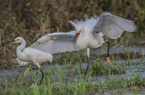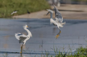 Snowy Egrets squabbling over fishing territory |