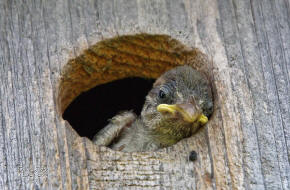 ![]() 31 "The Hot Chick" Found in the 2009 archives--a baby House Sparrow tries to get a breath of cooler air on a sweltering June day. It eventually fledged and flew away. |