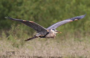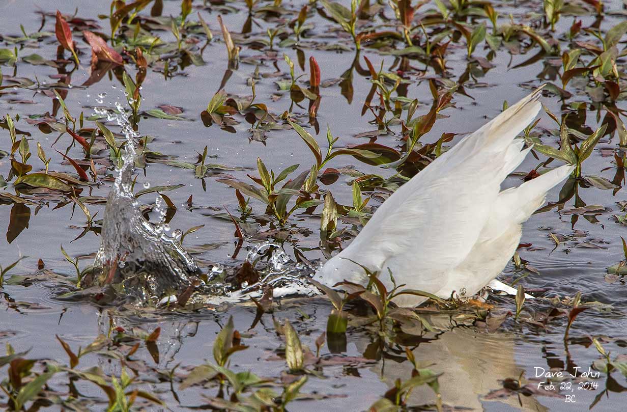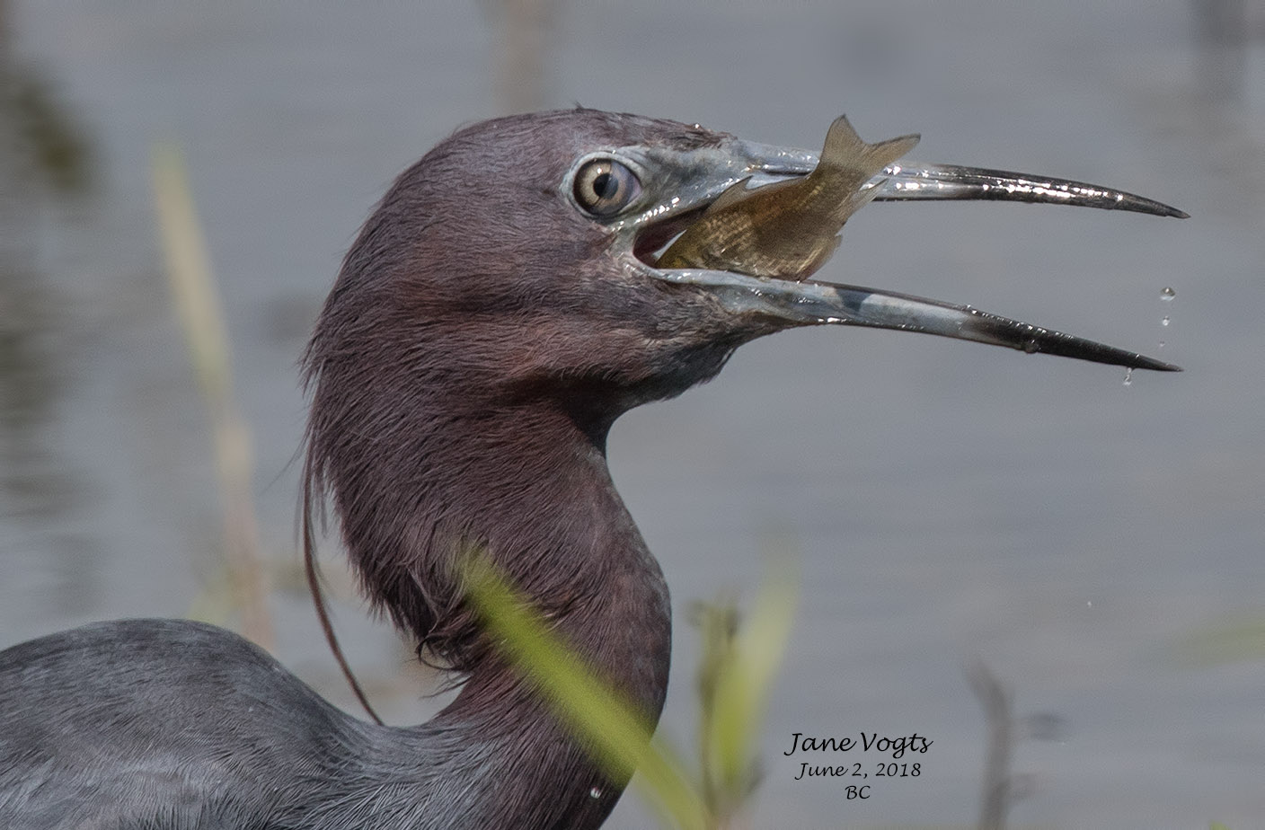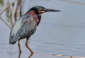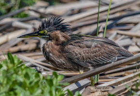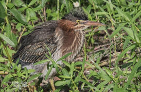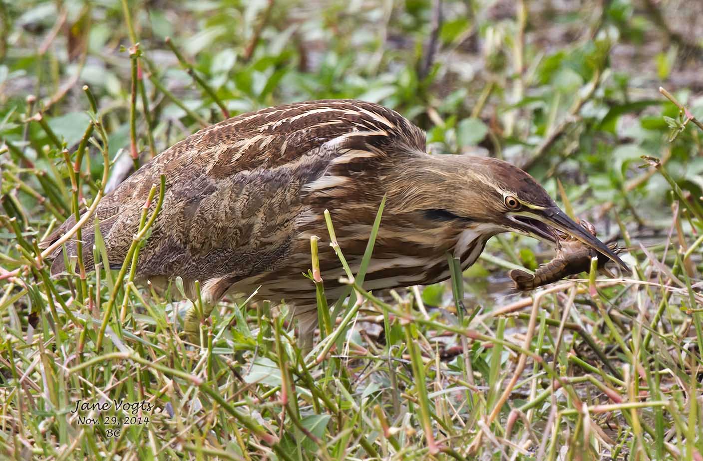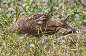 Juvenile Green Heron with a frog which still has its tadpole tail |