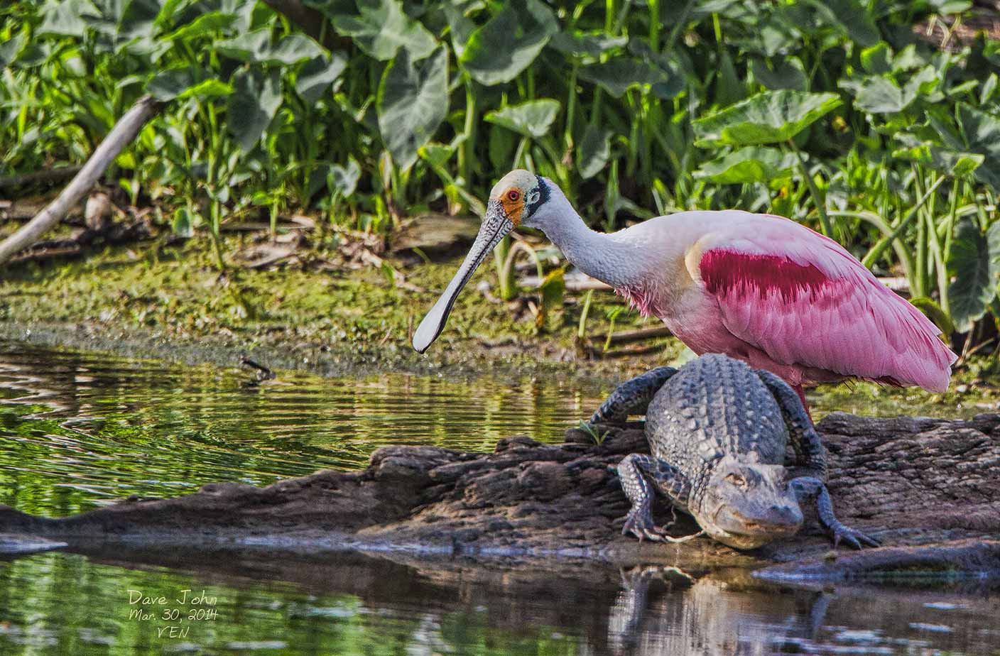 ![]() 58 Spoonbill sneaking behind a 'gator |