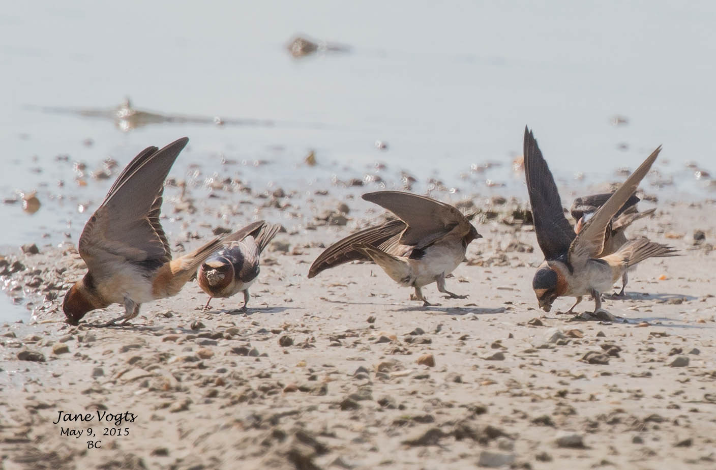 ![]() 4 Cliff Swallows collecting mud for nest building |