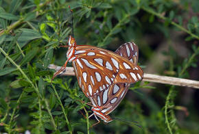 ![]() 2 Gulf Fritillary butterflies mating (female is facing up) |